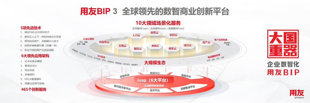 面對(duì)難得的市場(chǎng)和產(chǎn)業(yè)發(fā)展機(jī)遇,用友經(jīng)過6年的規(guī)模研發(fā)、持續(xù)迭代,以全新理念、全新技術(shù)、全新架構(gòu)、全新模式打造了面向企業(yè)和公共組織數(shù)智化的全新一代產(chǎn)品——用友BIP,并在平臺(tái)技術(shù)、應(yīng)用架構(gòu)、創(chuàng)新服務(wù)等方面實(shí)現(xiàn)多項(xiàng)重大突破與升級(jí),達(dá)到全球水平,包括5項(xiàng)技術(shù)、6大應(yīng)用架構(gòu)、465項(xiàng)創(chuàng)新服務(wù),覆蓋智能財(cái)務(wù)、數(shù)智人力、數(shù)智采購(gòu)、數(shù)智營(yíng)銷、智能制造、數(shù)智供應(yīng)鏈、數(shù)智研發(fā)、數(shù)智項(xiàng)目、數(shù)智資產(chǎn)及協(xié)同工作等十大核心領(lǐng)域,是目前全球領(lǐng)域覆蓋較多的企業(yè)云服務(wù)群。