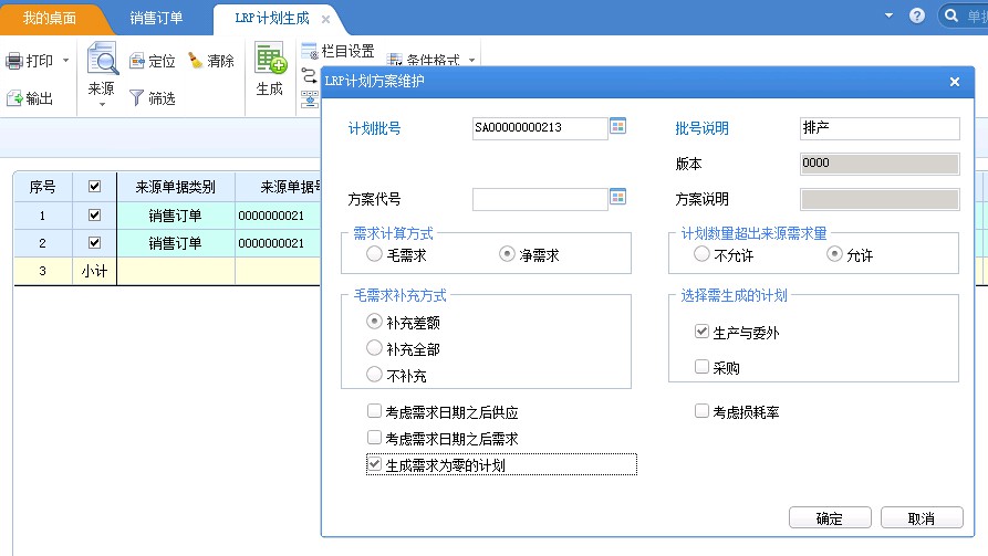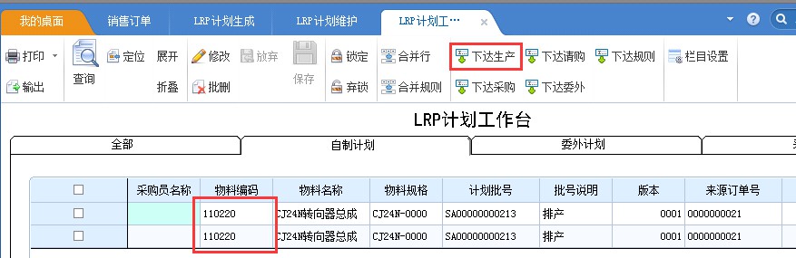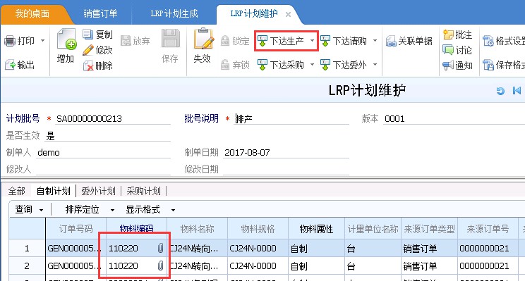 2.在LRP計劃作業(yè) - LRP計劃生產(chǎn)中查詢相應(yīng)銷售訂單,生成LRP生產(chǎn)計劃,在LRP計劃維護(hù)中聯(lián)查到相應(yīng)單據(jù)或者在LRP計劃工作臺查詢到相應(yīng)計劃,選擇需要下達(dá)生產(chǎn)的成品