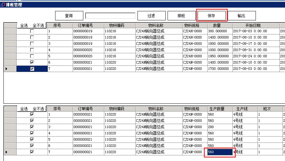 6.然后點擊相中需要排產(chǎn)的訂單,點擊進(jìn)行排班按鈕,自動根據(jù)條件計算出的排班信息在下方顯示,可以手動修改班產(chǎn)量、生產(chǎn)日期